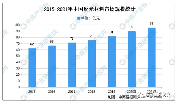 反光材料,廣泛應(yīng)用于交通標(biāo)志標(biāo)線、突起路標(biāo)、輪廓標(biāo)識(shí)、交通錐、防撞筒等各種道路交通安全設(shè)施,以及汽車號(hào)牌、衣物鞋帽、消防、鐵路、水運(yùn)、礦區(qū)等。隨著經(jīng)濟(jì)的高速發(fā)展,下游行業(yè)發(fā)展旺盛,推動(dòng)反光材料的發(fā)展。上海勞保技術(shù)展了解到,數(shù)據(jù)顯示,2019年中國反光材料市場規(guī)模達(dá)81億元。中商產(chǎn)業(yè)研究院預(yù)測,2021年我國反光材料市場規(guī)模將達(dá)95億元。